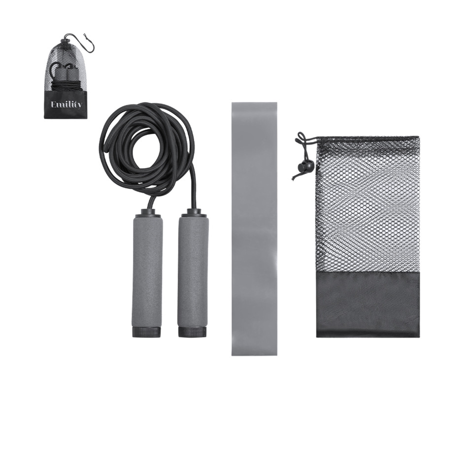 Set Fitness Zhiax. Set sportivo che include: 1 elastico da 25x5 cm in materiale TPE resistente e di media resistenza e 1 corda da 260 cm con maniglie HIPS rivestite in EVA. Confezionato in fodera in poliestere con chiusura a cordoncino e accessorio di regolazione.