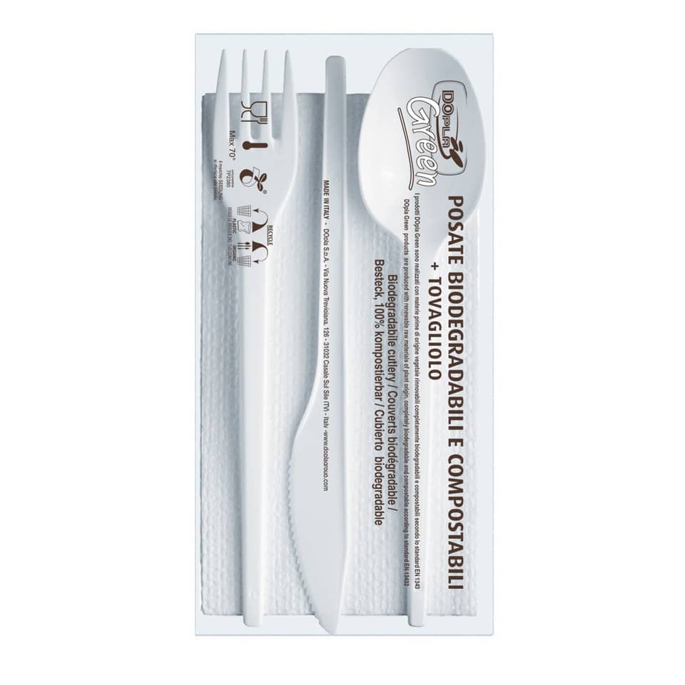 Set forchetta + coltello + cucchiaio + tovagliolo Dopla Tris ESTABIO - 33x33 cm 2 veli - conf. 100 pz - 3908