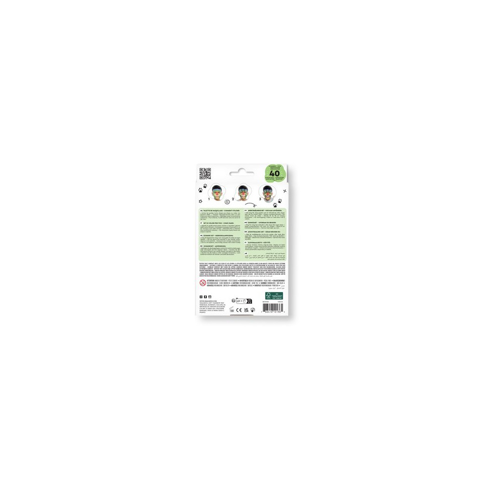 Trucco a base d'acqua. Il colore è delicato sulla pelle, a base d'acqua, traspirante, si asciuga piacevolmente sulla pelle e non appiccica, in modo che la pelle possa respirare liberamente. I colori per il trucco sono altamente pigmentati e ad alta intensità di colore. Si applicano facilmente con lo stick o con una spugna umida, sono a prova di sbavature dopo l'asciugatura e possono essere rimossi dal viso con la stessa facilità. I colori per il trucco sono ipoallergenici, privi di profumo e adatti anche alle pelli sensibili. Tutti gli ingredienti sono conformi alle autorizzazioni per i cosmetici e alle normative europee in materia di giocattoli e cosmetici. Confezione composta da 8 colori assortiti, spugna per il viso, pennello e istruzioni per l'uso. Fantasia arcobaleno.