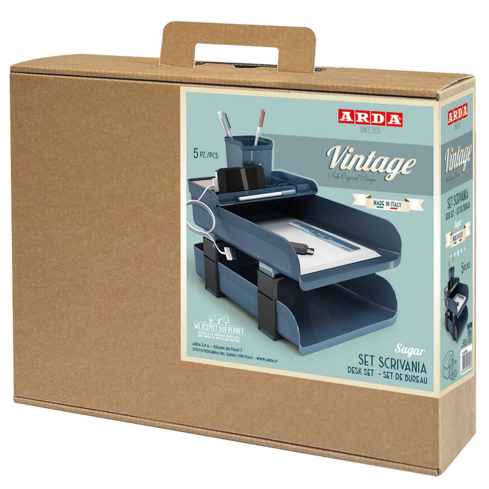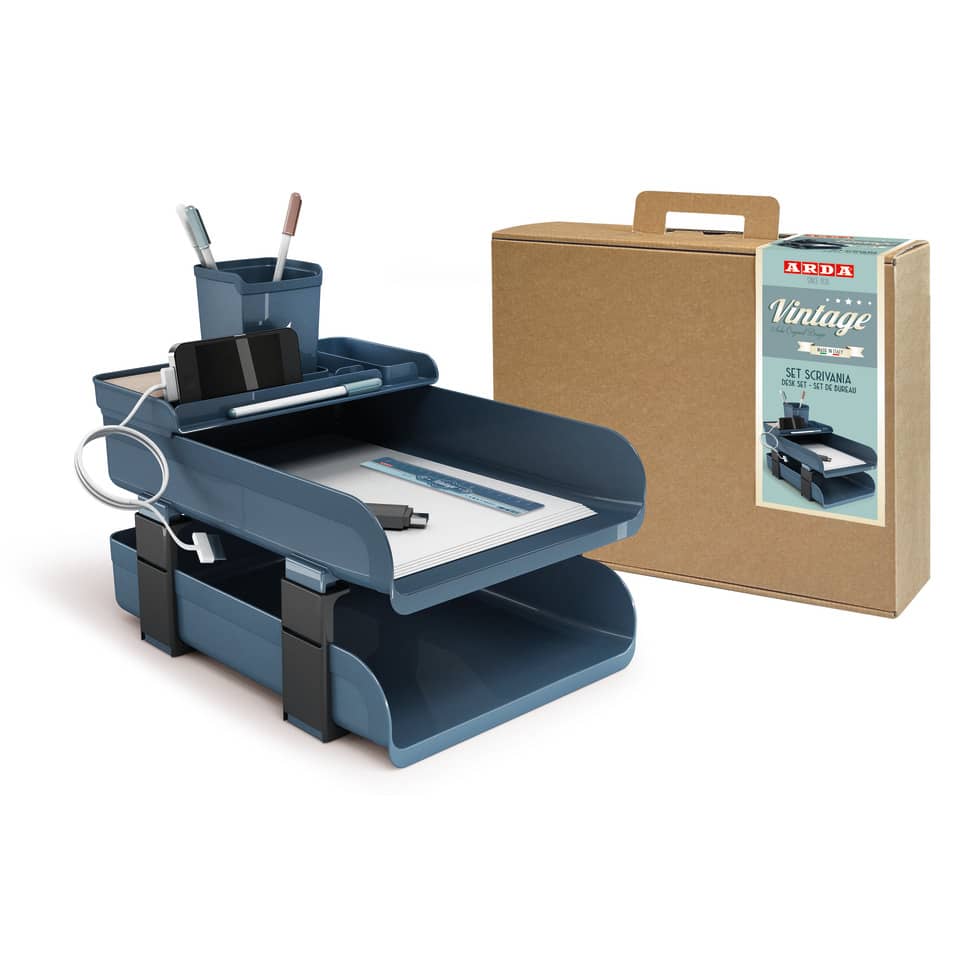 Porta in ufficio o in casa i romantici colori vintage: l'azzurro della carta da zucchero, il caldo colore del caramello e il bianco cremoso del latte. Set scrivania Vintage da 5 pezzi: 2 vaschette portacorrispondenza con distanziali, 1 bacinella, 1 portapenne e 1 righello 16 cm. In resistente PPL. Dimensioni L. 25,4 x P. 33,5 x H. 28 cm.