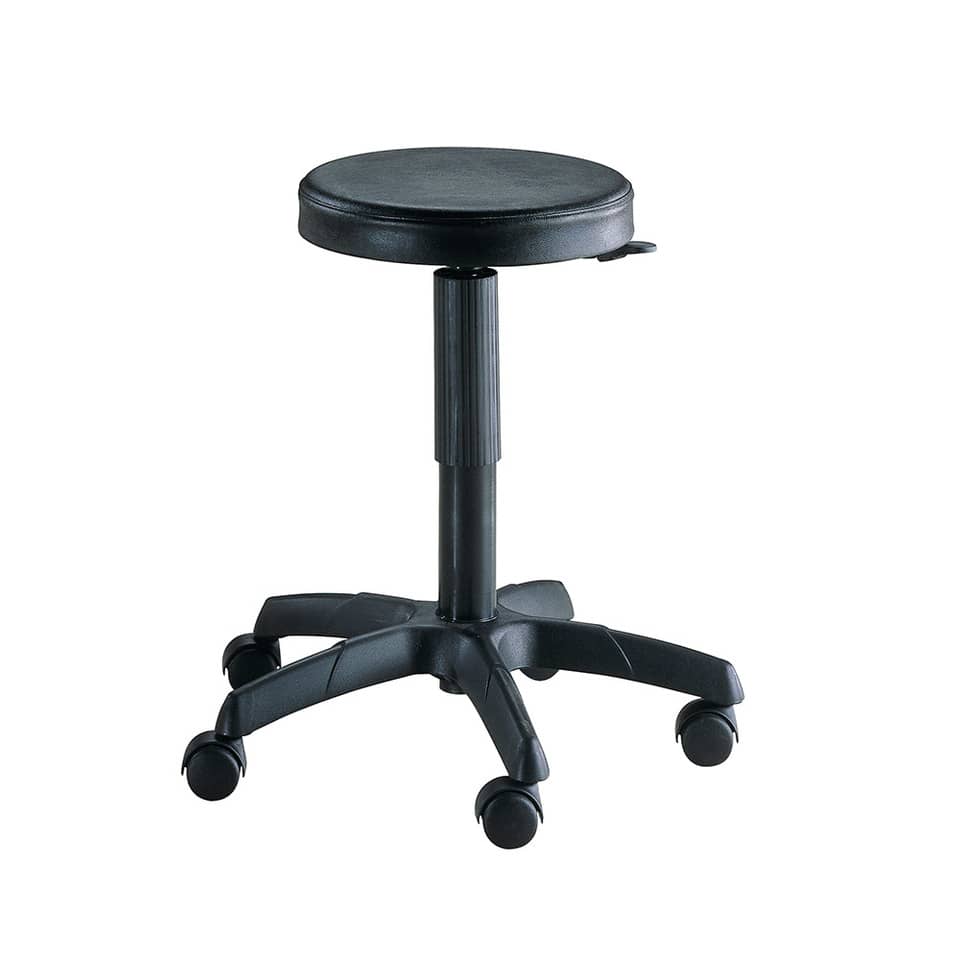 Il design di questa soluzione è stato studiato per integrarsi perfettamente in ambienti di lavoro moderni e dinamici, come laboratori, officine, catene di montaggio o postazioni di controllo qualità. La caratteristica principale di questo sgabello è la sua regolazione telescopica dell’altezza, che consente all’utente di adattarlo facilmente alle proprie esigenze e all’altezza del piano di lavoro. Questo, combinato con l'assenza di schienale, favorisce la libertà di movimento e l'accesso a spazi ristretti. La seduta è realizzata in poliuretano integrale, un materiale resistente, facile da pulire e confortevole anche dopo ore di utilizzo. Il poliuretano offre una buona resistenza all'usura, agli agenti chimici e all'acqua, rendendolo ideale per ambienti di lavoro gravosi. L'attenzione ai dettagli si estende anche alla base, progettata per garantire stabilità e sicurezza durante l'utilizzo. Questo sgabello è equipaggiato con un pratico poggiapiedi integrato, che offre un ulteriore supporto e contribuisce a ridurre l'affaticamento muscolare. L'assenza di braccioli facilita l'accesso sotto i piani di lavoro e incrementa la manovrabilità.