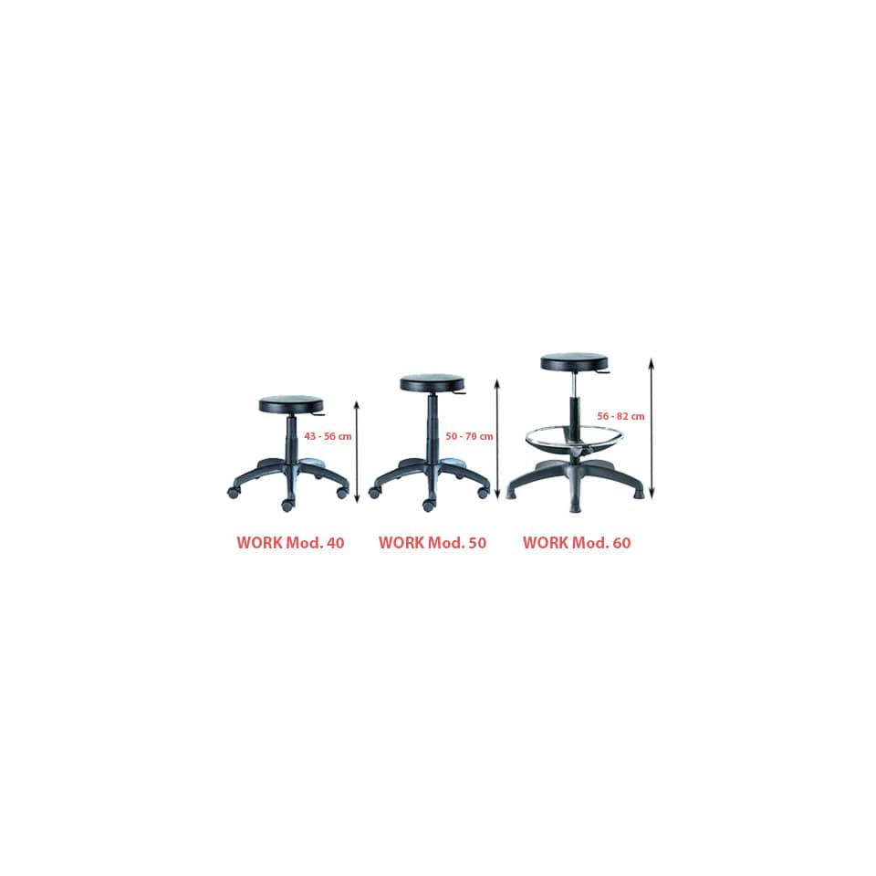 Sgabello tecnico medio Work 50 in PU flessibile nero lavabile e comodo sedile tondo imbottito con regolazione in altezza a gas. Pratico per lavori di precisione da seduti su tavoli di altezza da 80 a 90 cm. Ingombro 60 x 60 x 43 cm. Sedile D 35 cm. Base D. 600 in poliammide caricato 30% Fibra di Vetro e con ruote D. 50 mm in nylon ad innesto rapido. Regolazioni del sedile in altezza a gas da 50 a 70 cm. Peso 4,8 kg, portata massima 110 kg. Prodotto 100% Made in Italy. La garanzia è valida nell'ambito di un utilizzo normale e corretto della sedia e non si applica a quelle parti che sono naturalmente soggette ad usura, come i rivestimenti, le imbottiture e le superfici verniciate. La garanzia si applica a tutte quelle parti della sedia che ne garantiscono la funzionalità, come ruote, base, gas, meccanismi. Una qualsiasi manomissione o tentativo di riparazione da parte di persone non specializzate fa decadere automaticamente la garanzia. Questa garanzia non riconosce alcuna responsabilità o diritto di indennizzo per tutti gli eventuali danni, diretti o indiretti, causati da merce difettosa.