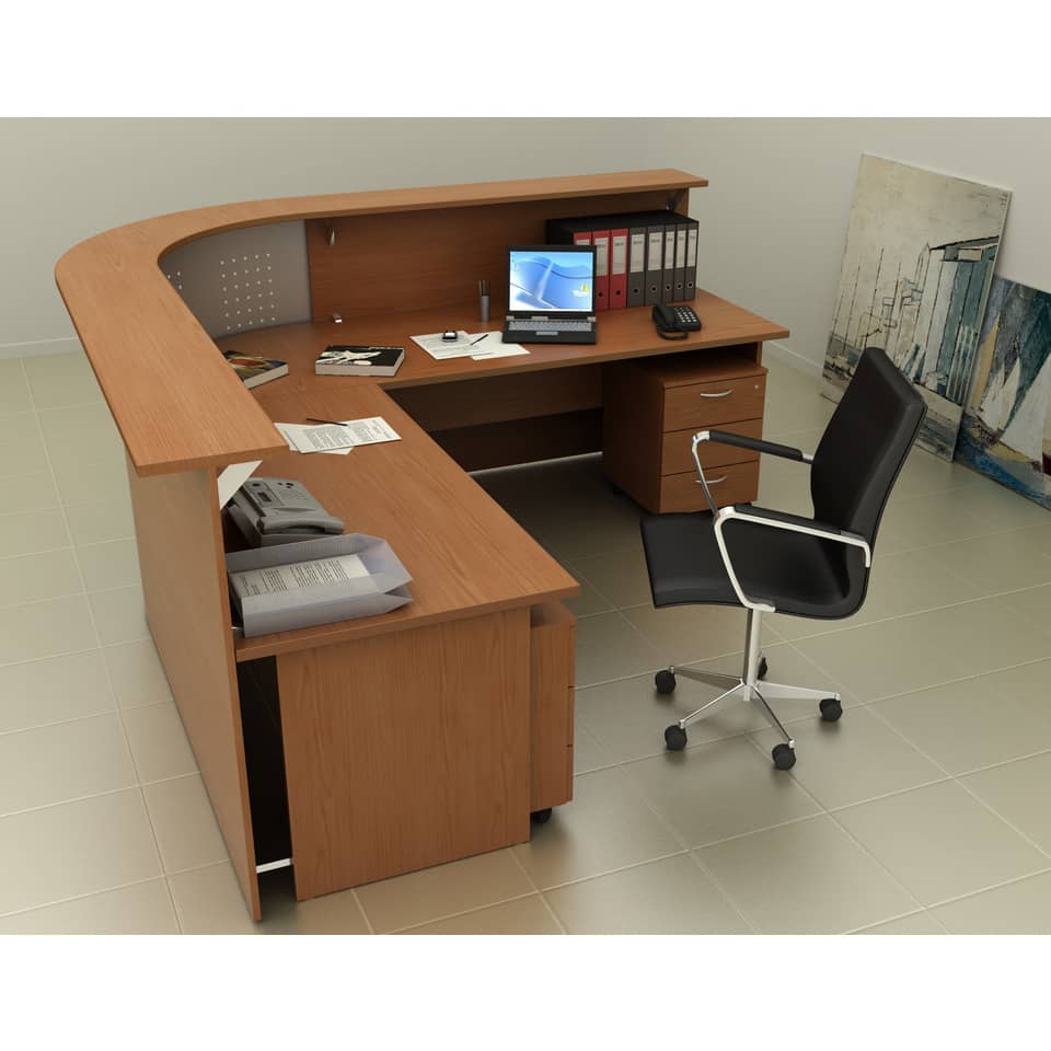 Bancone reception ad ang. 90° cm 96,5 X 96,5 x 115 h, noce chiaro. Sopralzi bancone in melaminico composti da top (P30 cm/sp. 28 mm , bordo antiurto in ABS 3 mm) e pannello frontale (H115 cm/ sp. 18 mm). Completi di piedini regolabili in altezza. I banconi, che si devono abbinare alle scrivanie della linea Presto con gambe pannello sono disponibili in tre larghezze: 80, 140 e 160 cm. Sono componibili per affiancamento e si possono unire anche al bancone angolare 90° (realizzato in melaminico e completo di pannello frontale in metallo). Il bancone ad angolo deve essere obbligatoriamente fissato ad una scrivania con bancone lineare sia alla sua destra che alla sua sinistra.
