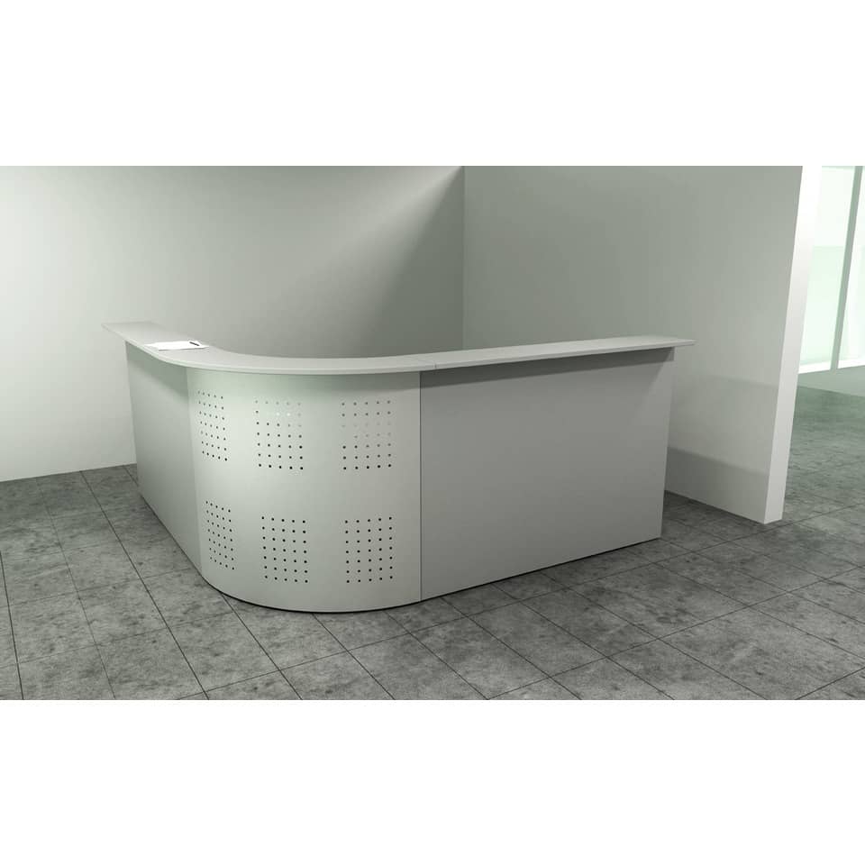 Bancone reception cm 80 X 30 X 115 h, grigio. Sopralzi bancone in melaminico composti da top (P30 cm/sp. 28 mm , bordo antiurto in ABS 3 mm) e pannello frontale (H115 cm/ sp. 18 mm). Completi di piedini regolabili in altezza. I banconi, che si devono abbinare alle scrivanie della linea Presto con gambe pannello sono disponibili in tre larghezze: 80, 140 e 160 cm. Sono componibili per affiancamento e si possono unire anche al bancone angolare 90° (realizzato in melaminico e completo di pannello frontale in metallo). Il bancone ad angolo deve essere obbligatoriamente fissato ad una scrivania con bancone lineare sia alla sua destra che alla sua sinistra.