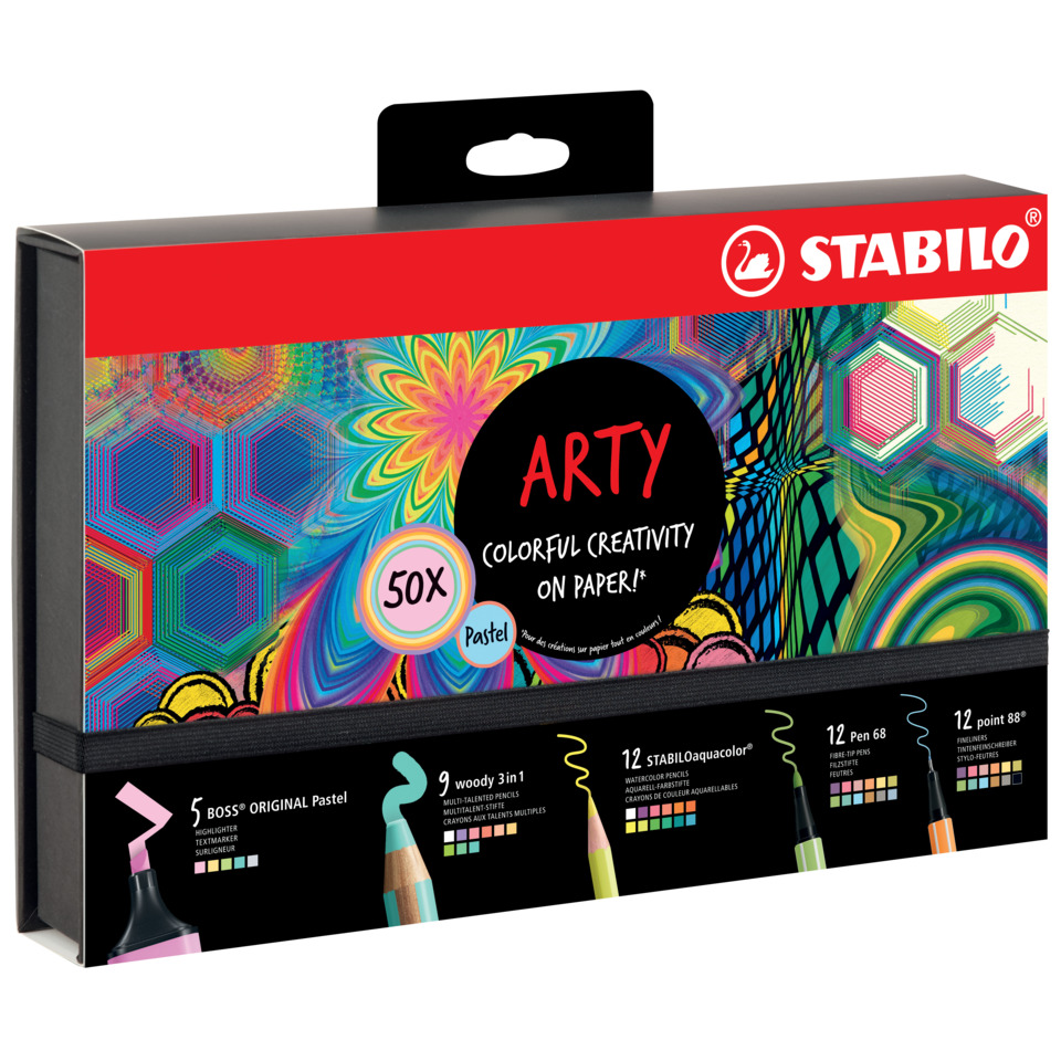 Set Stabilo Colorful Creativity on Paper in cartone con appendino. Contiene 5 pezzi Boss Original Pastel nei colori: 113, 125, 133, 158, 194; 9 pezzi Woody 3 in 1 nei colori: 100, 201, 301, 302, 303, 355, 402, 503, 570; 12 pezzi Aquacolor nei colori: 100, 200, 205, 220, 221,350, 355, 365, 455, 505, 536, 550; 12 pezzi Pen 68 nei colori: 11, 12, 23, 25, 28, 29, 34,62, 67, 88, 93, 94; 12 pezzi point 88: 11, 12, 23, 25, 28, 29, 34, 46, 62, 67, 88, 93. Contenuto totale 50 pezzi.