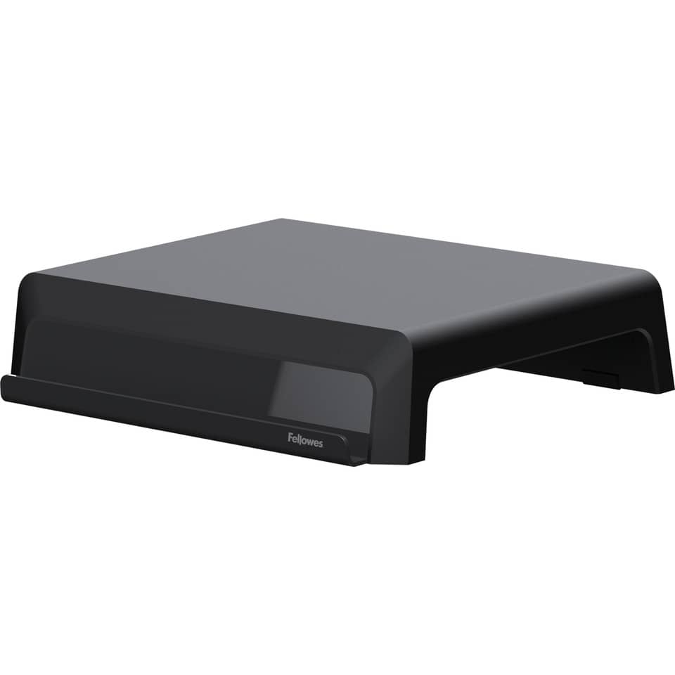 Breyta™ Supporto per monitor con 3 impostazioni di altezza facili da configurare per favorire una buona postura ergonomica; i supporti per la gestione dell'altezza si inseriscono nel corpo principale sotto la piattaforma. Regolazioni in altezza: 8,2 / 11,6 / 15,1 cm. Peso massimo del monitor: 15 kg. Design compatto e portatile, facile da trasportare: ideale per ambienti di lavoro ibridi. Ripiano per dispositivi integrato con accesso al cavo di ricarica. Realizzato con materiali riciclabili al 100%. Garanzia 5 anni. Certificazione FIRA in corso. Colore nero.