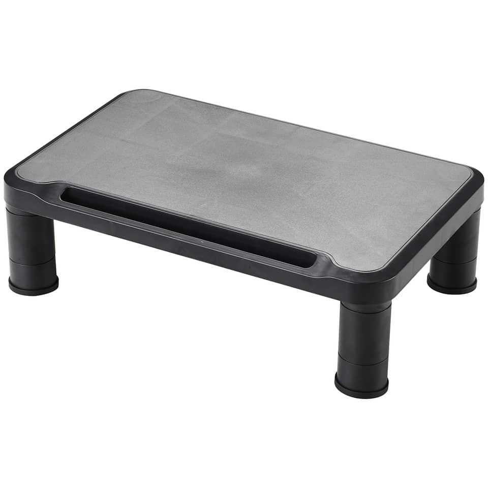Porta monitor regolabile in altezza nero. Dimensioni: 38 x 24 x 11,2 cm. Peso max: 20 Kg. Regolabile su 3 livelli di altezza: 6,2/8,2/11,2 cm.