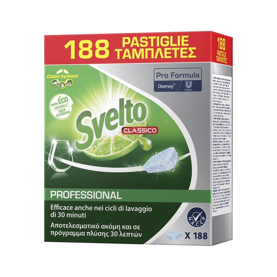 Le pastiglie del Detergente lavastoviglie Svelto Professional Tablets sono pre-dosate, il che elimina il rischio di utilizzare una quantità eccessiva o insufficiente di detergente. Basta inserire una pastiglia nell'apposita vaschetta della lavastoviglie e avviare il ciclo di lavaggio. La confezione da 188 pezzi garantisce una lunga durata e un ottimo rapporto qualità-prezzo. L'estratto di limone non solo conferisce un profumo fresco e gradevole alle stoviglie, ma contribuisce anche a neutralizzare gli odori sgradevoli. Il prodotto è compatibile con tutti i tipi di lavastoviglie e può essere utilizzato con qualsiasi livello di durezza dell'acqua. La formula biodegradabile rispetta l'ambiente senza compromettere l'efficacia. Ottimo anche per il lavaggio di biberon e oggetti delicati, garantendo la massima igiene e sicurezza. Questo prodotto è un valido alleato per chi cerca una soluzione completa e affidabile per la pulizia delle stoviglie.