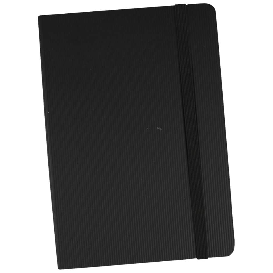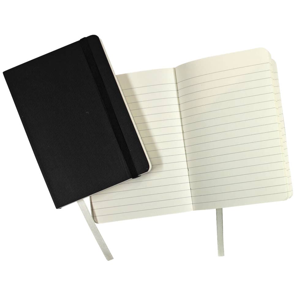 Taccuino da 95 fogli con copertina morbida in similpelle. Chiusura ad elastico e segnalibro. Carta da 80 g/mq, tasca per archiviare piccoli appunti. Righe A6 nero