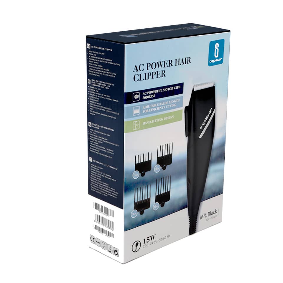 Tagliacapelli presa AC. In dotazione: unità principale; 4 pettini guida (3/6/9/12mm); bottiglietta d'olio; spazzola. Dimensioni 230x45x60 mm. Con un motore potente e 3000 rpm, taglia anche i capelli più difficili senza alcuna pressione. Lame fisse e lame rimovibili. Triplo interruttore per una perfetta regolazione del taglio, soddisfano il tuo stile e i tuoi desideri. Grazie ad un particolare principio, si può utilizzare senza alcun rischio per la pelle, anche con un contatto vicino. Materiali principali ABS e acciaio inox. Voltaggio 220-240V ~. Frequenza 50/60Hz. Lunghezza del cavo 1.65m. Certificazione CE, RoHS. Colore nero.