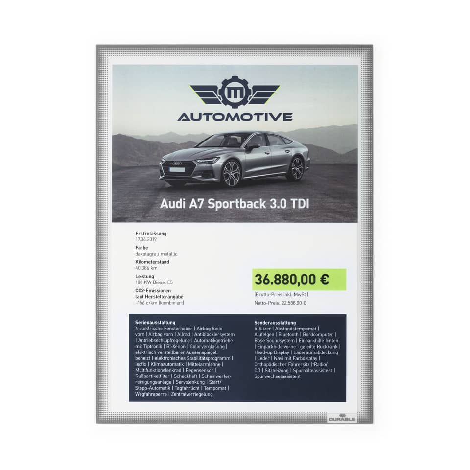 La soluzione specifica per l'esposizione su superfici curve: le tasche porta documenti statiche sono ideali per esibire le offerte sui parabrezza delle auto, sulle vetrine dei negozi e sui banchi alimentari. Ideale per esporre informazioni sulla superficie interna delle vetrate, anche curva come i parabrezza delle auto. Per documenti formato A4, ad es. offerte e listini prezzi. Cornice ad adesione statica (senza adesivo). Resistente al calore fino a ca. 70°C. Resistente ai raggi UV fino a 2 anni. Può essere rimossa senza lasciare residui: perfetta per essere riutilizzata più volte. Facile sostituzione dei documenti grazie all'apertura sul retro. Può essere utilizzata sia in formato verticale che orizzontale. Dimensioni interne: 303 x 216 mm (H x L). Dimensioni esterne: 323 x 236 mm (H x L)