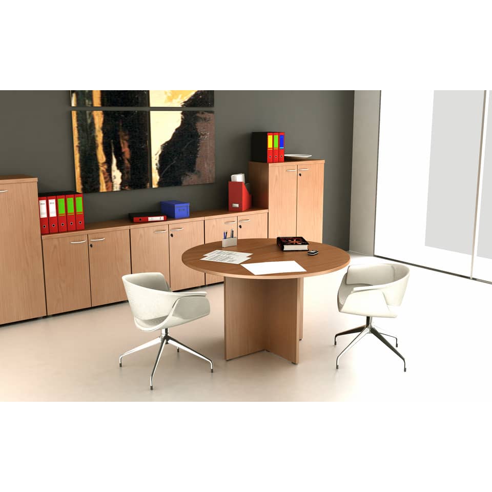 Tavolo riunione rotondo colore noce chiaro , dimensioni in cm: Ø 120 H72. Piano spessore 22 mm, profilo in PVC antiurto sagomato, gambe spessore 22 mm.Presto, linea economica ma caratterizzata da soluzioni tecniche di livello superiore. Realizzata in materiale bilaminato nobilitato melaminico spessore 22 e 18 mm, conforme norme UNI e EN classe E1.
