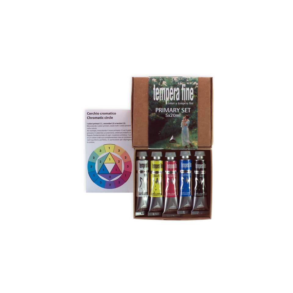 Colore a tempera fine in tubetto di alluminio da 20 ml. Grado di coprenza: semicoprente. Perfetta per le attività scolastiche. Pasta densa e corposa che rende il colore adatto anche a sfondi scuri. Alta resistenza alla luce secondo la normativa ASTM - D4303 per la tempera. Compatibili con tutti i colori e gli additivi per pittura ad acqua. Tempo di essicazione breve. Granulometria media 10 micron. Confezione da 5 colori primari assortiti.