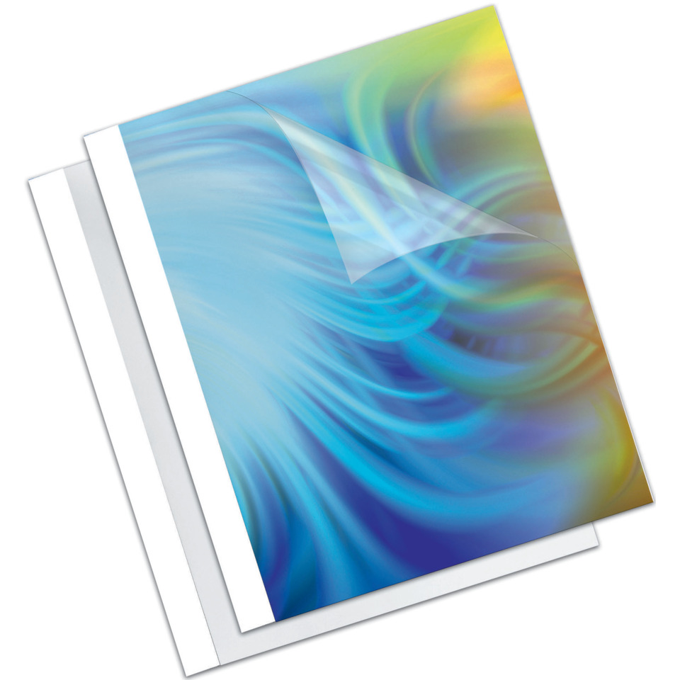 Termocopertina con fronte in PVC trasparente, grammatura 150µm, spessore 3 mm e retro in cartoncino goffrato da 200 gr. Confezione da 100 pezzi.