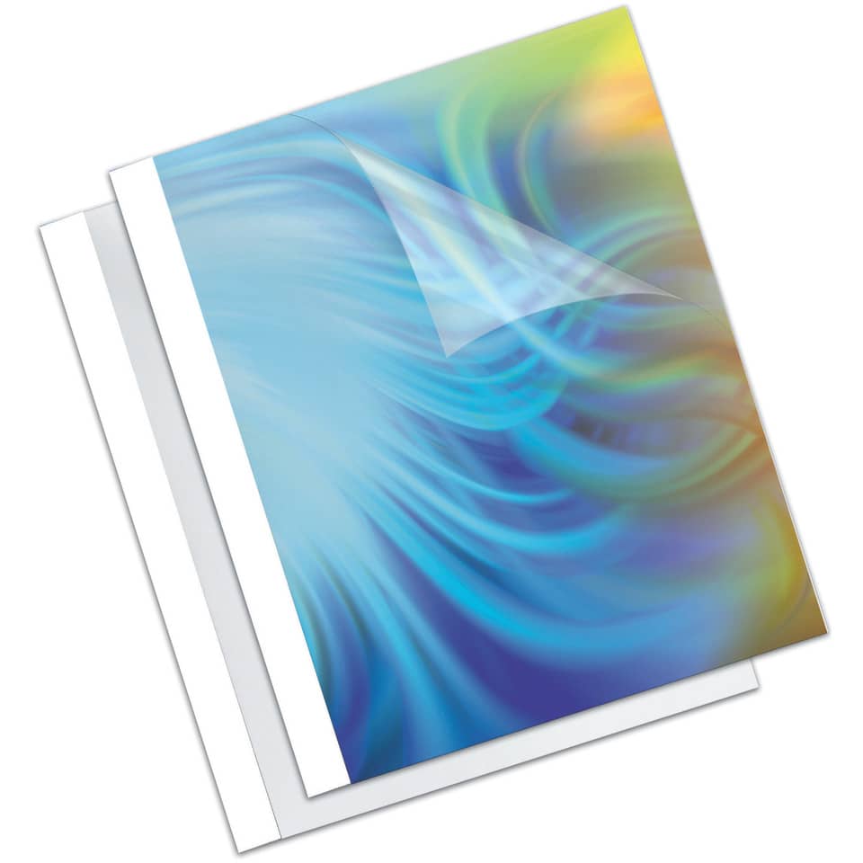 Termocopertina con fronte in PVC trasparente, grammatura 150µm, spessore 4 mm e retro in cartoncino goffrato da 200 gr. Confezione da 100 pezzi.