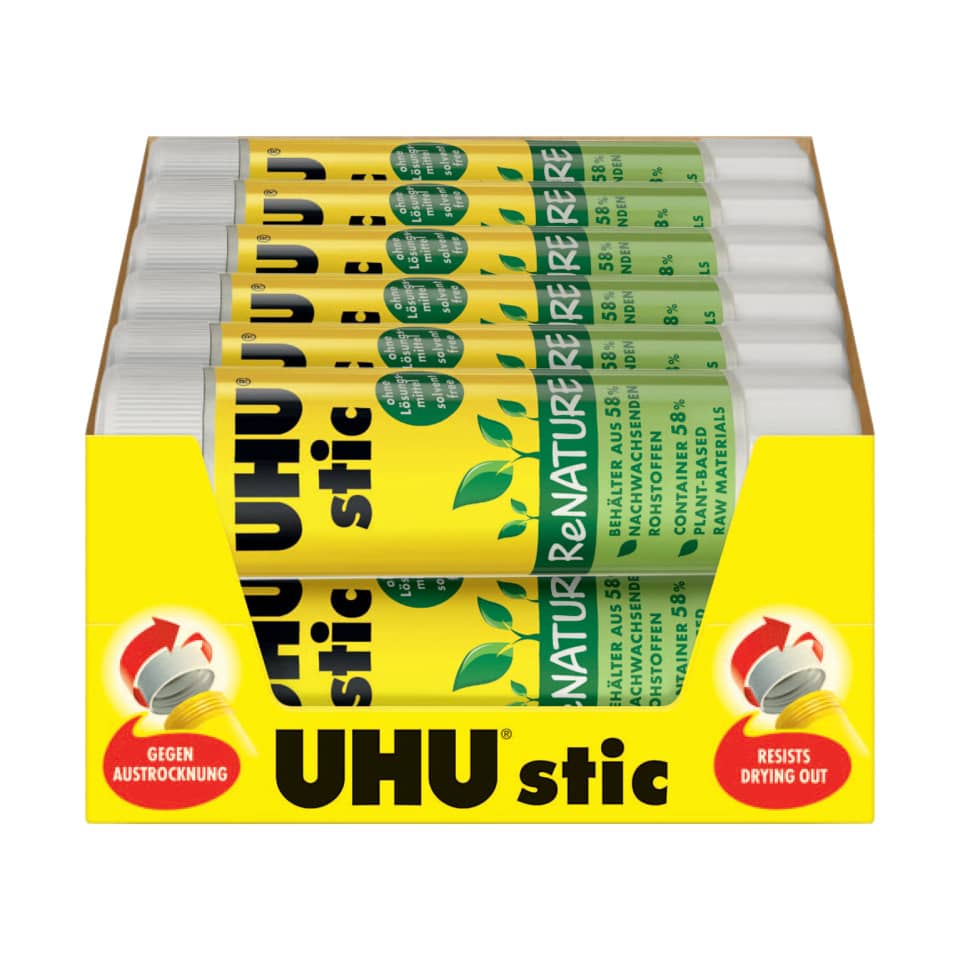 UHU Stic ReNature è una colla realizzata per il 70% con materie di origine naturale e senza solventi e con un contenitore di "bioplastica" realizzato con il 58% di materie di origine vegetale. Lo stick è dotato di pratico tappo a vite che previene l'essicazione, si stende facilmente ed è eliminabile con acqua fredda (30°).