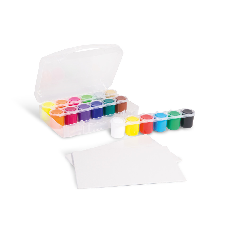 Valigetta Hobby, composta da 18 vasetti di colori acrilici fini in colori assortiti (12 colori standard, 4 fluo, un vasetto oro ed uno argento). Ogni vasetto è composto da 25 ml di colore. Valigetta multiuso in polipropilene, al suo interno contiene anche due cartoncini telati formato 22x14 cm.