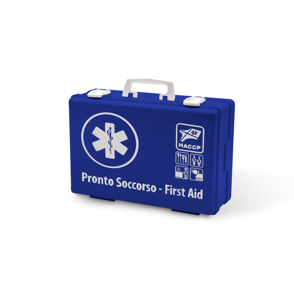 MEDIC 2 HACCP valigetta. I prodotti definiti dispositivi medici, contenuti nel kit di pronto soccorso sono conformi a MDR 745/2017 del 05/04/2017. Valigetta MEDIC 2 colore blu, con supporto per attacco a parete, maniglia per trasporto, guarnizione in neoprene, chiusura con due clip rotanti. Contenuto: 3 Tampobende 100x120 sterili - 2 Bende 4 x 8 DIN 61634 elastiche - 1 astuccio POCKET KIT azzurro contenente - 5 Preparati 3,5 g GEL PER USTIONI sterile - 1 Garza 10x10 cm per Ustioni sterile - 1 Confezione da 12 garze 18x40 cm sterili - 1 Rocchetto 5 m x 2,5 cm TNT - 1 PLASTONET benda tubolare 2 misure - 2 ICE PACK ghiaccio istantaneo - 2 paio sterili - 1 Forbici Lister cm 14,5 DIN - 2 Sacchetti RIFIUTI SANITARI - 2 Soluzioni saline sterili 500 ml FLACONE / CE - 1 Tappo soluzione lavaggio oculare - 1 Termometro digitale - 2 Lacci piatti emostatici in nitrile - 2 Teli triangolari TNT 96 x 96 x 136 cm - 1 Astuccio cerotti 5 forme BLU DETECTABLE 100 pezzi - 2 VENTO 4 lingue rianimatore bocca bocca - 6 spille di sicurezza - 1 Benda EMOCONTROL antiemorragica - 1 Pinzetta - sterile 10 cm - 1 SOFT1 BLU bendaggio adesivo 6 cm x 5 m - 1 EXTRA LONG BLU 50 cerotti 18 x 2 cm - 10 ditali in lattice misura L confezione da 100 pezzi. Dimensioni: 395 x 135 x H.270 mm. Peso: 4,30 Kg.