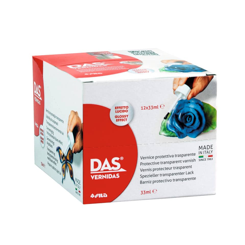 Vernice vetrificante trasparente e protettiva con effetto lucido a base solvente, essicca molto rapidamente e lascia le superfici lucide e uniformi. Ideale su DAS, è particolarmente indicata per esaltare gli effetti marmorizzati creati con DAS Idea Mix. I flaconi hanno tappo di sicurezza. Formato 33 ml.