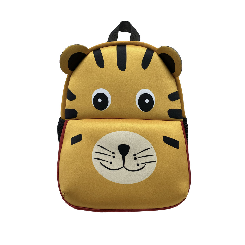 Zaino dalla simpatica forma a tigre. Composizione: tasca frontale pieghevole con scomparto a cerniera nascosta, scomparto principale con cerniera interna separata e porta nome/indirizzo, schiena imbottita e tracolle, striscia riflettente, 2 scomparti laterali e cintura toracica. Materiale esterno in neoprene, fodera interna in poliestere. Dimensioni: 30 x 10 x 25 cm. Ha una capienza di circa 7,5 L.